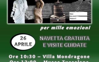SCARICA LA LOCANDINA Visite Guidate "26 Aprile 2026" UN SOLO BIGLIETTO, MILLE EMOZIONIDomenica 26 aprile torna l’appuntamento alla scoperta dei Musei Tuscolani! Un’intera giornata tra arte, storia e cultura con un unico biglietto integrato (€10, valido 12 mesi).PROGRAMMA DELLA GIORNATA Mattina• 10:30 → Visita guidata a Villa Mondragone• 12:00 → Museo Tuscolano Scuderie Aldobrandini Pomeriggio• 16:00 → Parco Archeologico Culturale di Tuscolo• 17:30 → Museo del Vino🕒 ORARI APERTURA MUSEI• Villa Mondragone → apertura 10:30• Museo Tuscolano → 10:00 – 19:00• Parco di Tuscolo → 9:30 – 18:30• Museo del Vino → 10:00 – 13:00 | 16:00 – 21:00 NAVETTA[...]